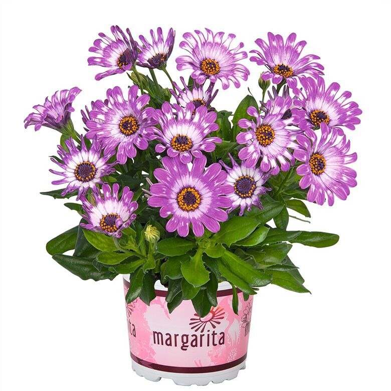 Остеоспермум "Margarita Purple Spoon" — сорт с необычными цветками, лепестки которых напоминают форму ложки. Растение отличается насыщенным фиолетовым цветом с серебристым оттенком у основания лепестков, что подчёркивает их уникальную форму. Высота куста 30–35 см, ширина 40–45 см. Форма -округлый, компактный, хорошо разветвлённый куст. Цветки - пурпурно-фиолетовые, диаметром 5–8 см, с ложковидными лепестками. Период цветения - с мая до поздней осени при благоприятных условиях. Тип растения -многолетник.