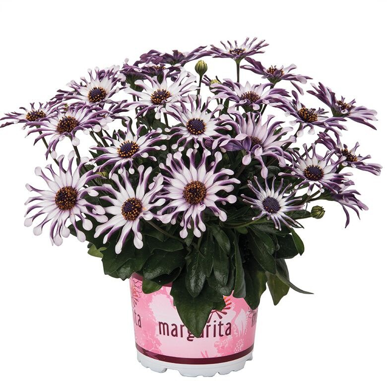 Остеоспермум "Margarita White Spoon" — сорт с необычными бело-фиолетовыми цветками, лепестки которых по центру прижаты (согнуты), что создаёт эффект ложки. Растение отличается обильным и продолжительным цветением до первых заморозков. Высота куста 30–35 см, ширина куста 40–45 см. Листва - глянцевая, насыщенного зелёного цвета. Форма куста - округлый, компактный, хорошо ветвится. Цветки - соцветия-корзинки диаметром 4–10 см с бело-фиолетовой окраской. Тип растения -многолетник.